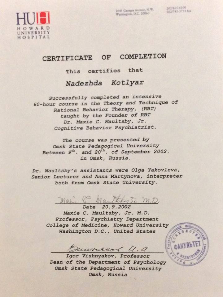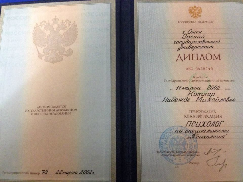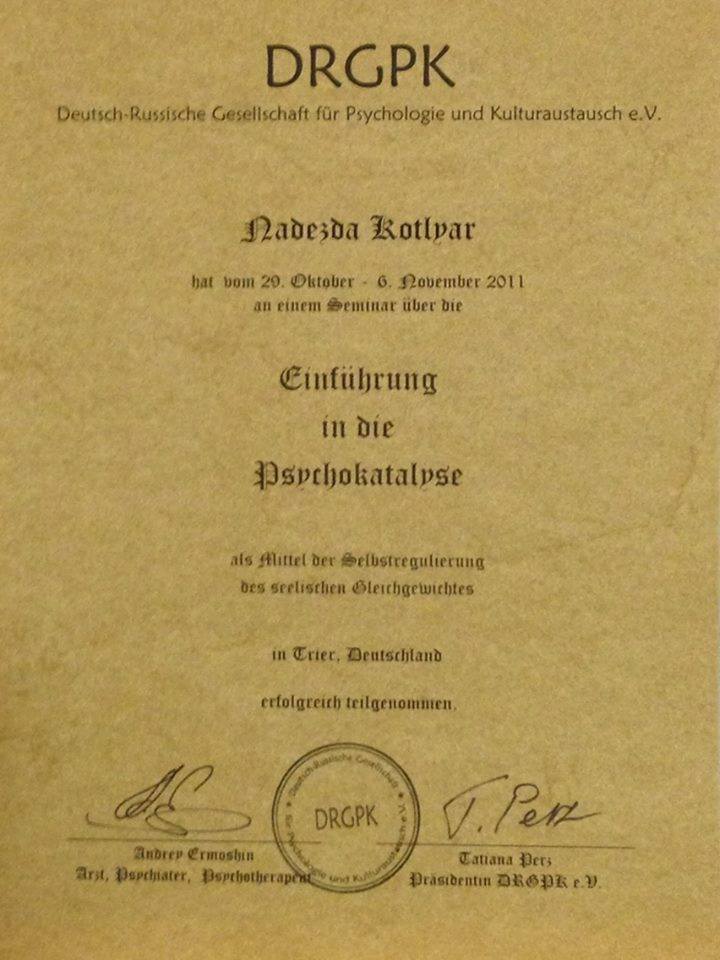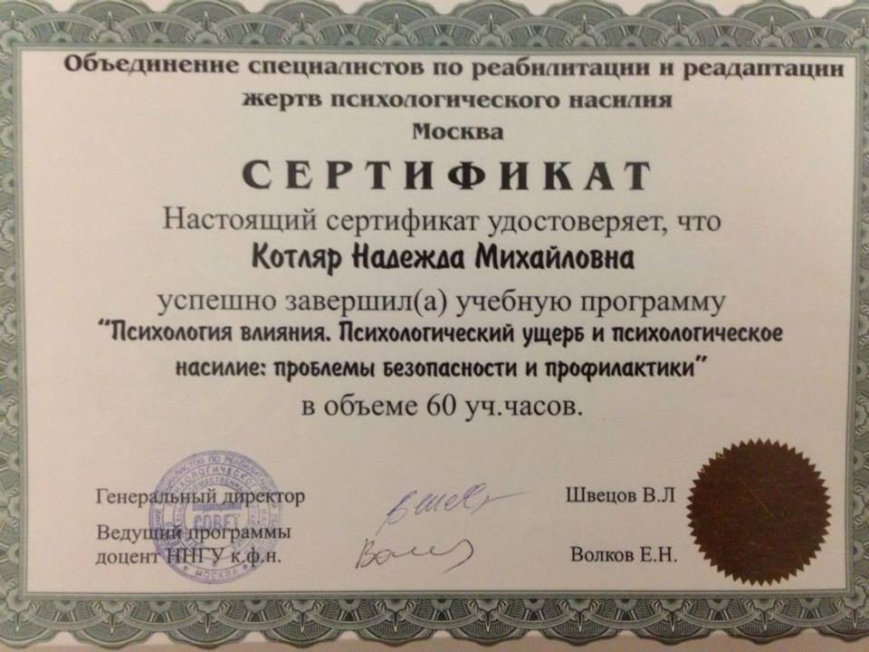 Надежда Котляр, психотерапевт, психолог, сертифицированный консультант, действительный член Профессиональной Психотерапевтической Лиги.