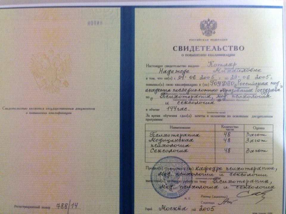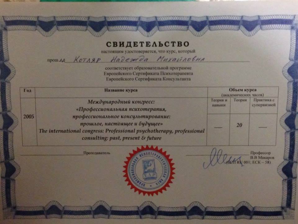 Надежда Котляр, психотерапевт, психолог, сертифицированный консультант, действительный член Профессиональной Психотерапевтической Лиги.